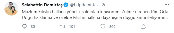 Kişisel sosyal medya hesabı Twitter'dan İsrail saldırılarına ilişkin paylaşımda bulunan Demirtaş, "Mazlum Filistin halkına yönelik saldırıları kınıyorum. Zulme direnen tüm Orta Doğu halklarına ve özelde Filistin halkına dayanışma duygularımı iletiyorum" diye yazdı.
