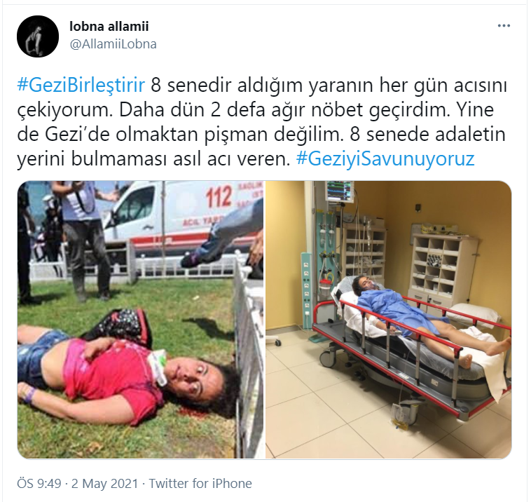 '#GeziBirleştirir 8 senedir aldığım yaranın her gün acısını çekiyorum. Daha dün 2 defa ağır nöbet geçirdim. Yine de Gezi'de olmaktan pişman değilim. 8 senede adaletin yerini bulmaması asıl acı veren. #GeziyiSavunuyoruz'