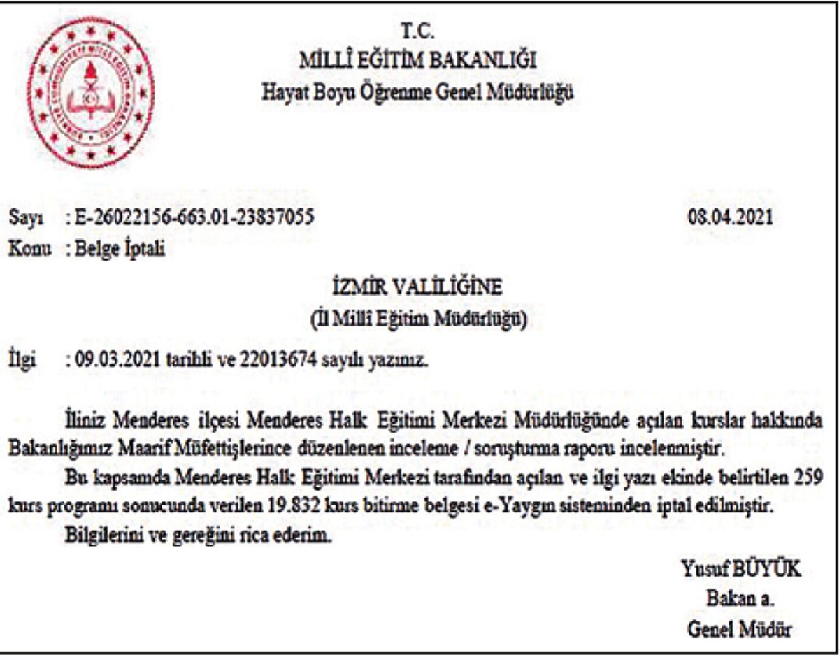 Sözcü'den Sultan Uçar'ın haberine göre, Hayat Boyu Öğrenme Genel Müdürü Yusuf Büyük, İzmir Menderes Halk Eğitim Merkezi'ndeki skandalla ilgili harekete geçti ve Bakanlık, 19 bin 832 belge iptal etti. İzmir Valiliği'ne isim listesi resmi yazıyla bildirildi. HEM Müdürü İsa Elbir, açığa alınıp, dava açıldı. Suçlamaların odağındaki Menderes HEM Müdürü İsa Elbir, "Adli, yargılama başladı. Ne olup bittiğini ben de bilmiyorum. Bakanlık, protokol olmadan kurs açıldığı için belgeleri iptal etti. Fatura bana kesildi. Bir tek ben suçlandım. İlçe müdürü, şube müdürleri izin vermezse, kurslar açılamaz. Belge satışı yok" dedi.